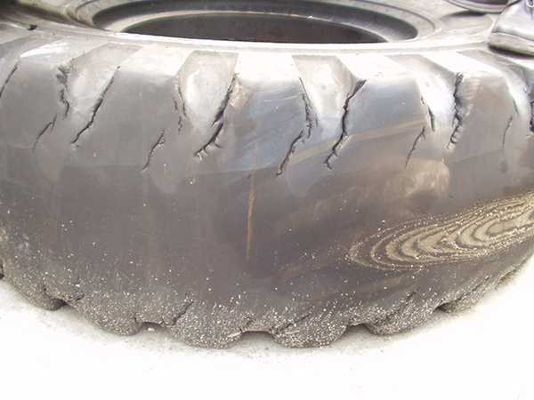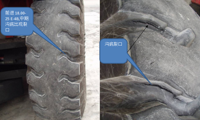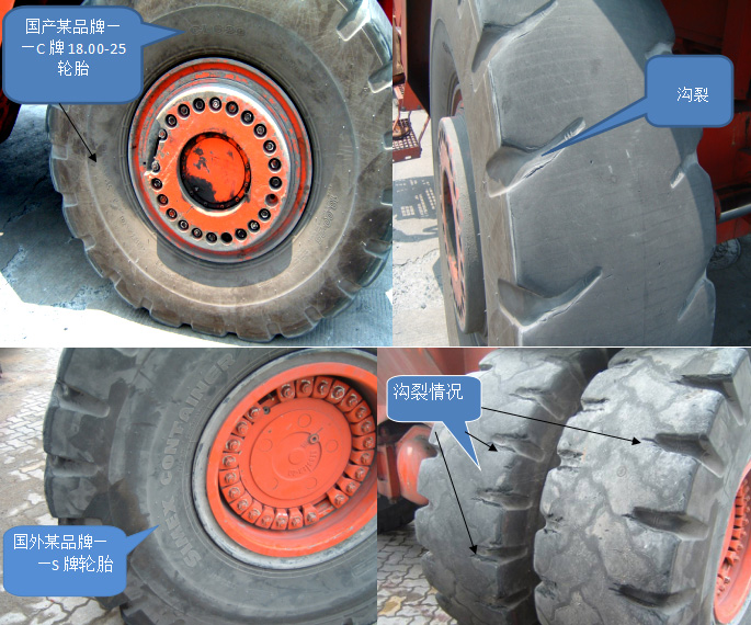?高負荷、低速速、頻繁轉向,輪胎與路面間產生很大的摩擦力,導致正面吊前輪會出現花紋端點裂口、后輪會出現花紋基本裂口,這是正常現象。